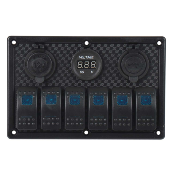 Upgrade your machine with the sleek and contemporary 6 Gang Switch Panel, perfect for enhancing both functionality and aesthetics. Made of high-quality aluminum with a rubber seal-cap to ensure water-tight protection, this panel is ideal for marine use. It includes a cigarette lighter socket, USB charging ports, and a volt meter, making it an all-in-one solution for your power needs.