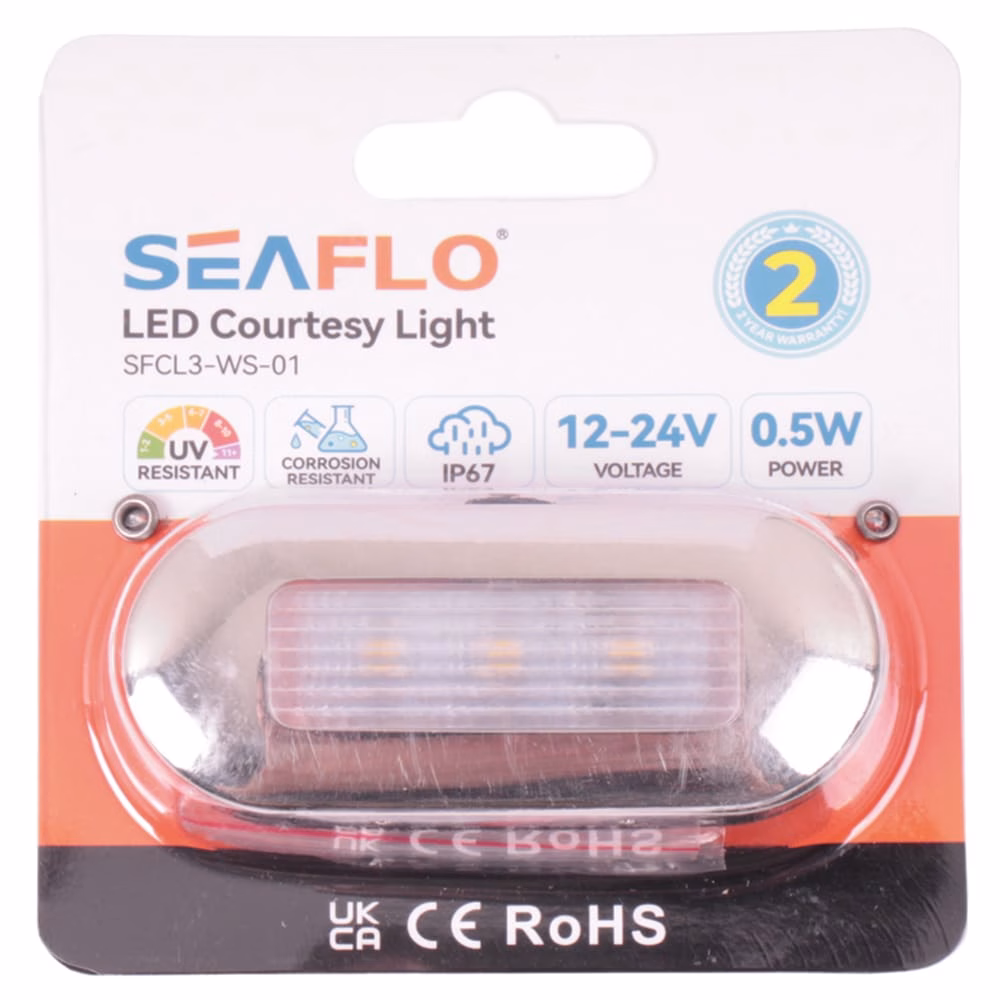 The Seaflo 12-24 Volt Flush Mount LED Courtesy Lamp is a premium lighting solution designed to enhance onboard safety and convenience with sleek, modern illumination. Crafted with 316 stainless steel, this courtesy lamp offers exceptional corrosion resistance and durability, making it ideal for harsh marine environments. Its flush mount design allows for a seamless installation on decks, cabins, steps, or any surface where low-profile lighting is required. Operating efficiently between 12 and 24 volts, this lamp features three powerful 0.5 watt LEDs that produce bright, consistent light in a daylight colour temperature range of 5500-6300K, offering clear visibility without glare. Rated IP67 for waterproof and dustproof protection, it is built to withstand immersion and rough weather conditions, ensuring reliable performance wherever your vessel takes you.