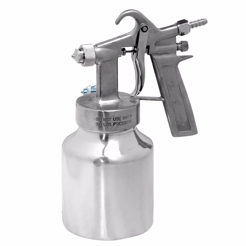 800cc suction canister: Increases productivity by minimizing refill interruptions. The generously sized paint cup is positioned below the gun, drawing material via suction and allowing for extended spray sessions. This design is particularly useful when covering wider surfaces or working with multiple coats. Its aluminium construction is easy to clean and durable enough for regular DIY use.